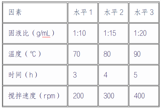 The experimental results indicate that the optimal combination is A ₂ B ₂ C ₂ D ₂ (solid-liquid ratio 1:15g/mL, temperature 80 ℃, time 4 hours, stirring speed 300rpm), which is consistent with the results of the single factor experiment.